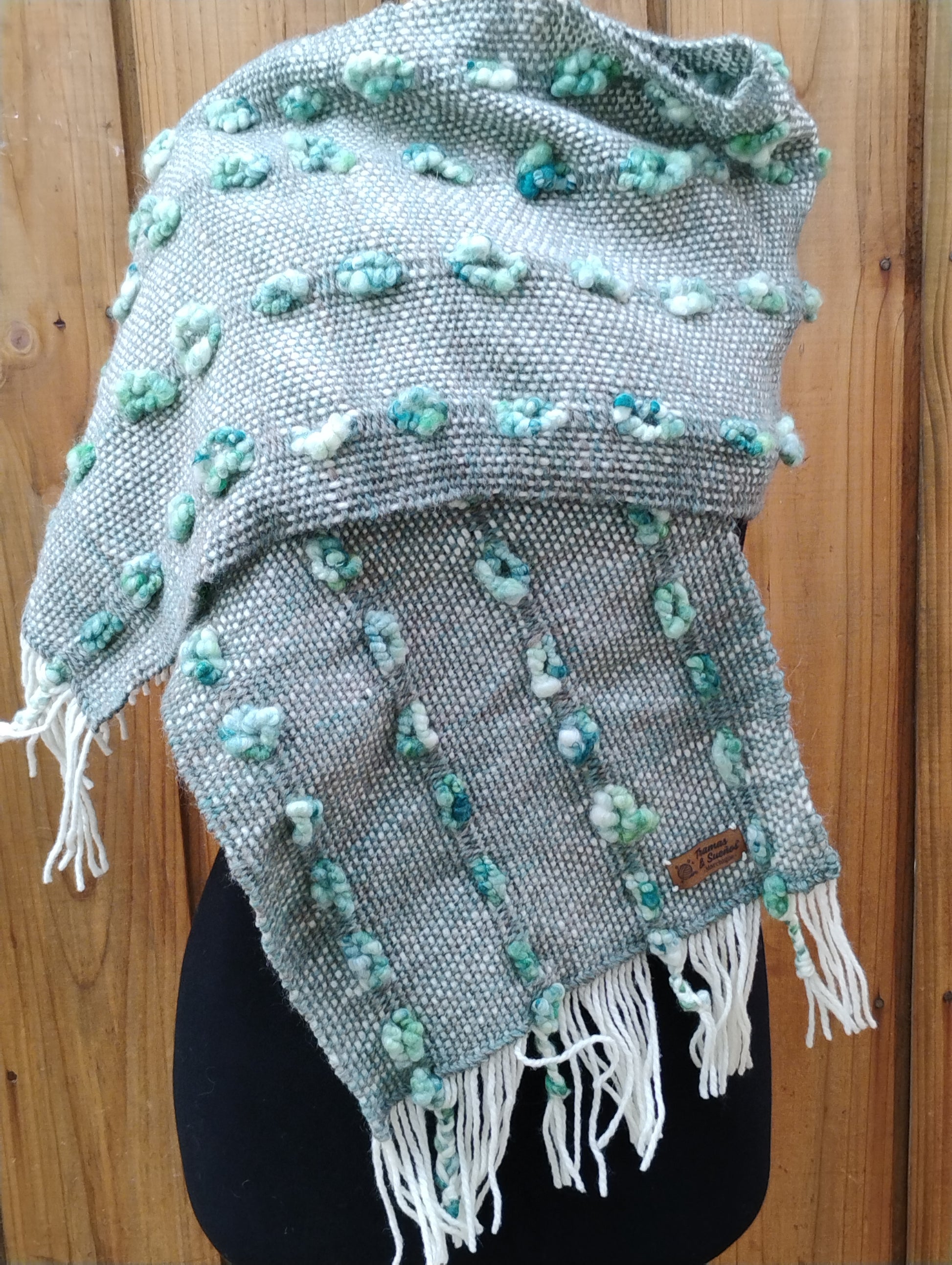 Bufanda en lana de oveja, tejida en telar María, con aplicaciones de cintas de vellón con brillos.
