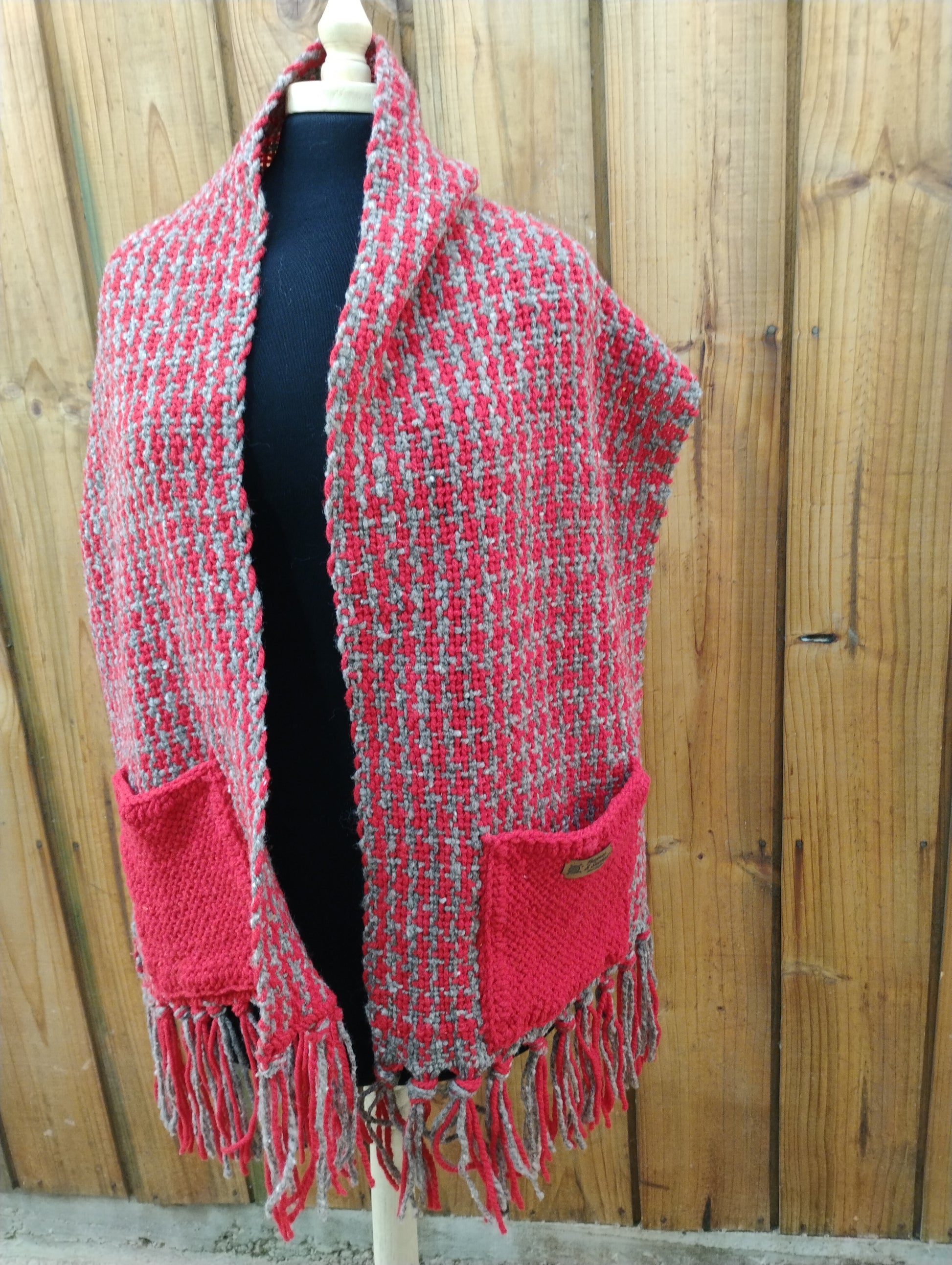 Bufanda en lana cardada de oveja teñida a mano en tono rojo, tejida en telar María, con aplicación de bolsillos.