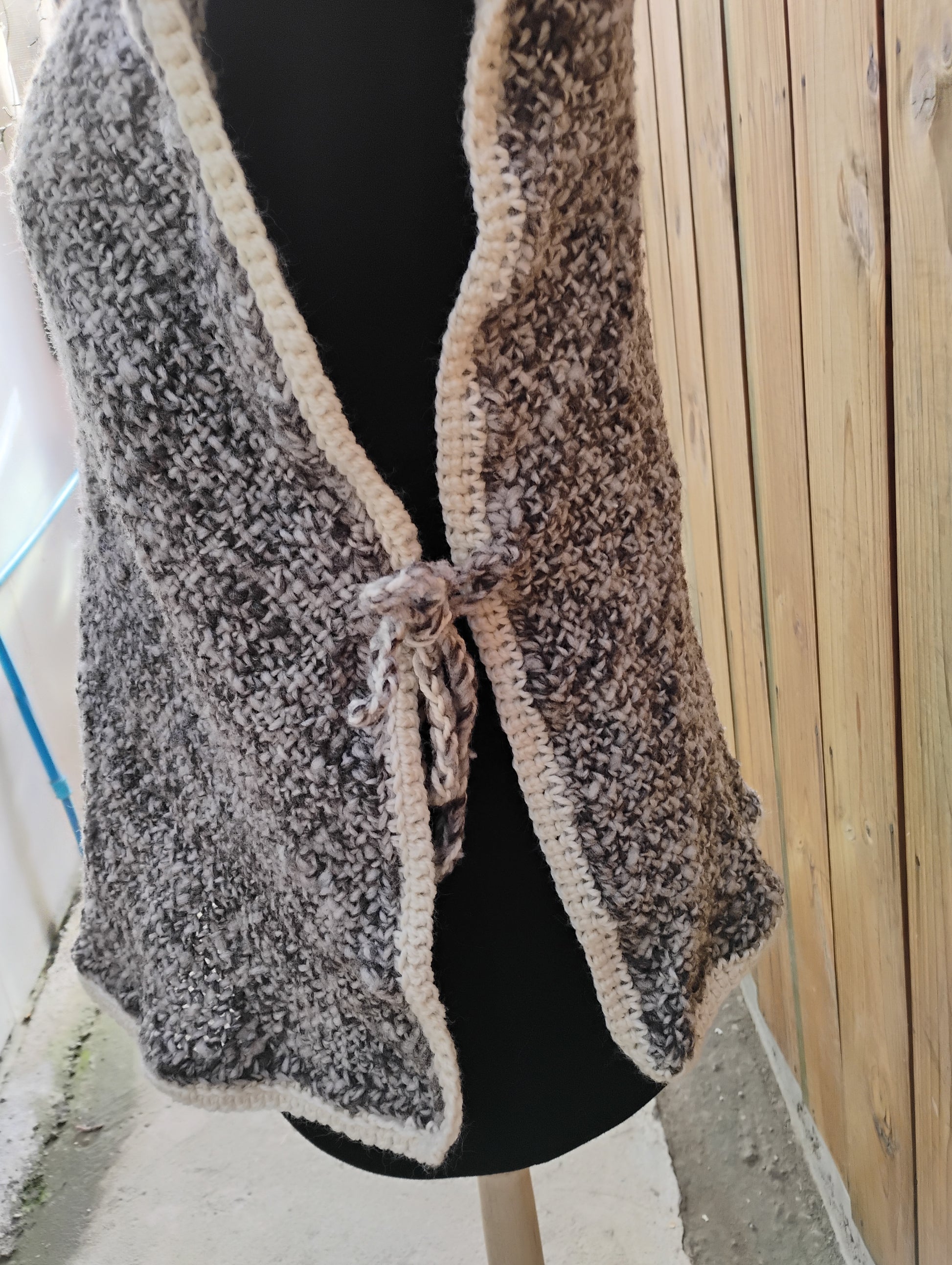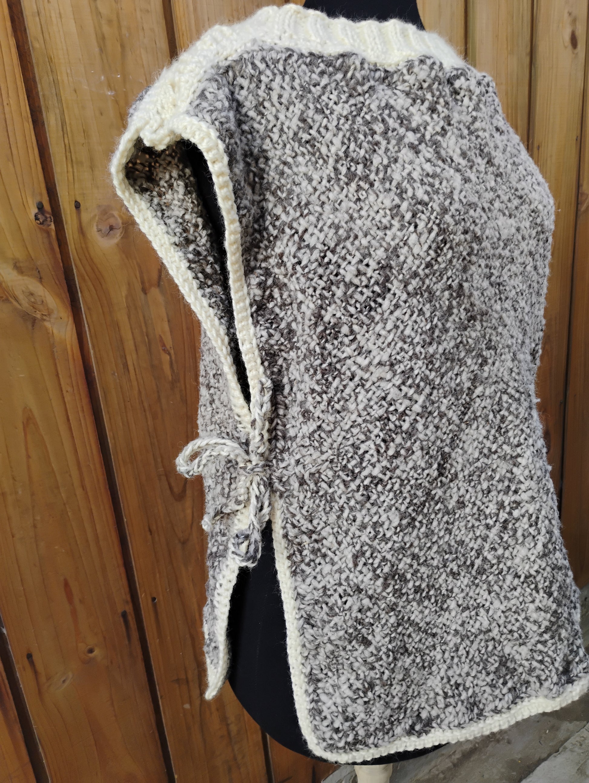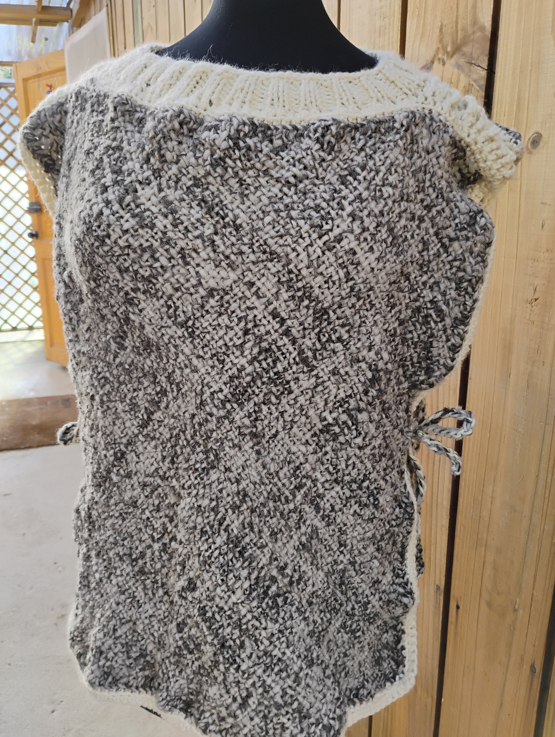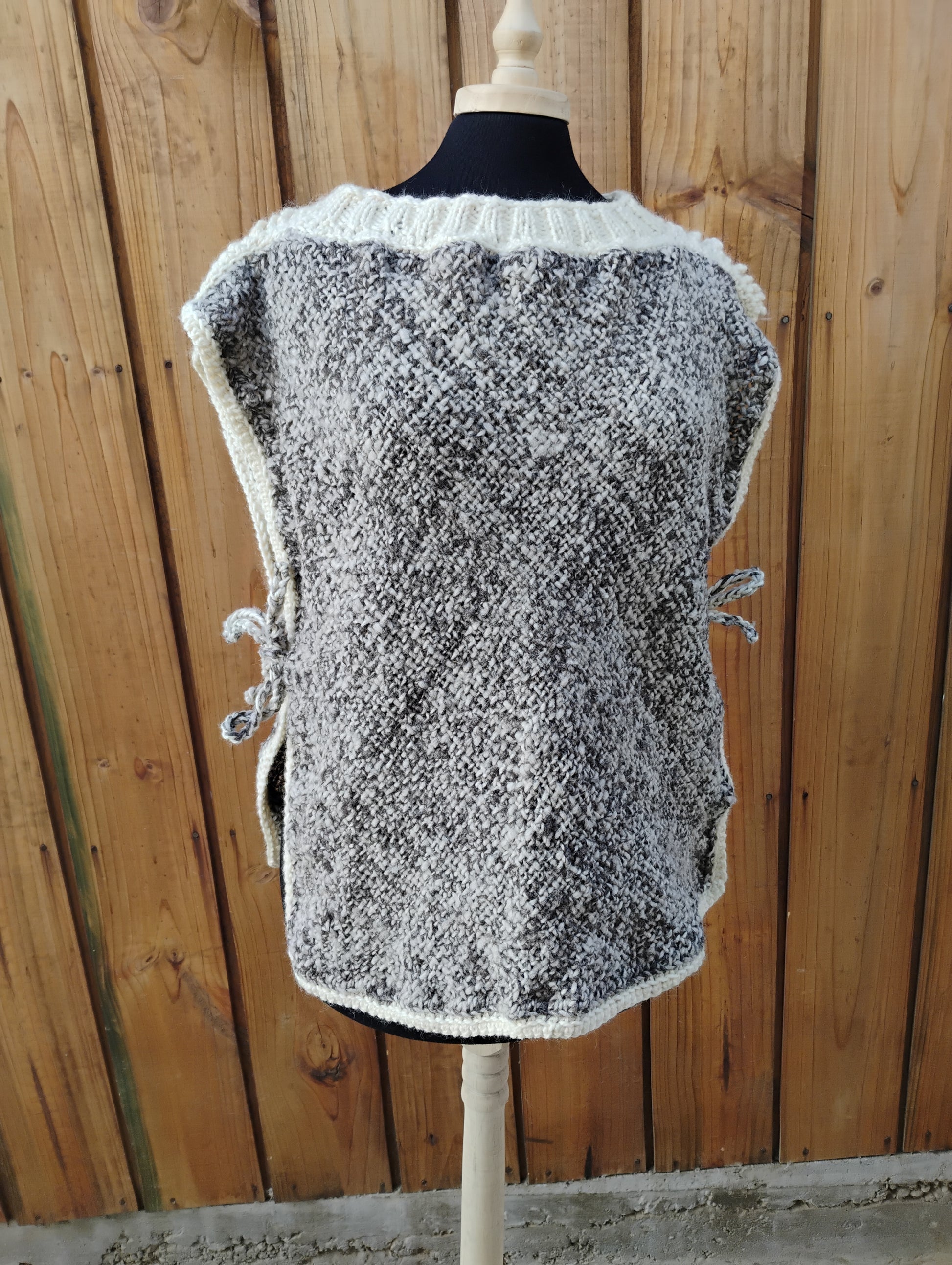 Chaleco sin mangas con cuello, en lana peinada de oveja en cuello y cardada en cuerpo, colores jaspeado gris y crudo, tejido en bastidor cuadrado.