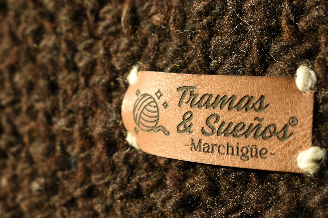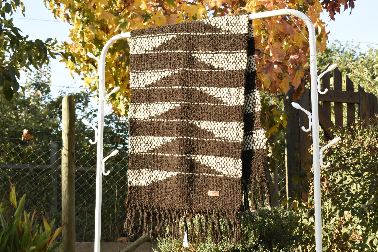 Piecera en lana peinada de oveja castaña, hilada a mano en huso, tejida en telar María. Diseño de puntos entrelazados con lana de oveja Corriedale color crudo.